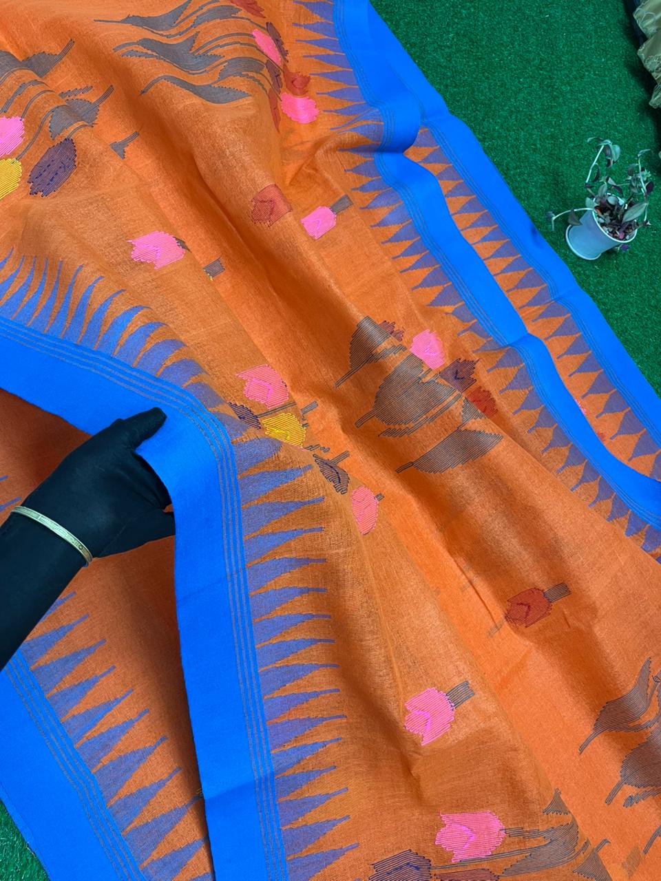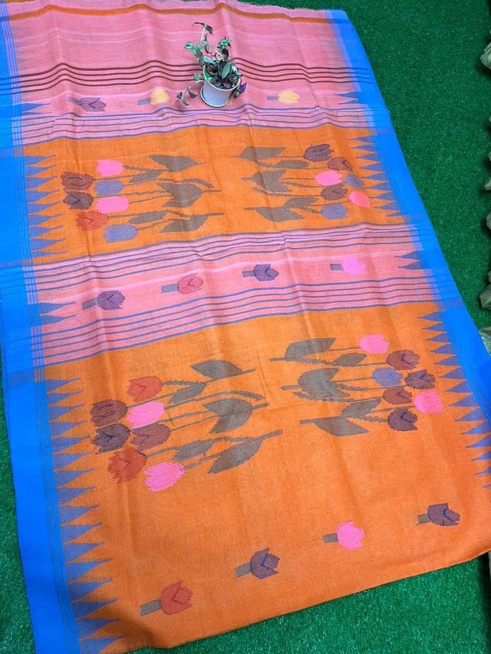 উজ্জ্বল কমলার সাথে নীল পাড়ের অসাধারণ কনট্রাস্ট। বড় ফুলেল টিউলিপ মোটিফ শাড়িটিকে করেছে নজরকাড়া ও প্রাণবন্ত।